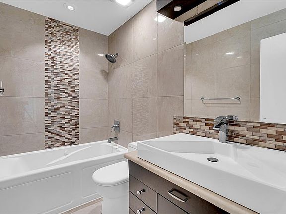 Stylish lightingGranite countertopsEye-catching backsplashContemporary floating sinksSpacious open floor planSleek tile floorsElegant wooden cabinets