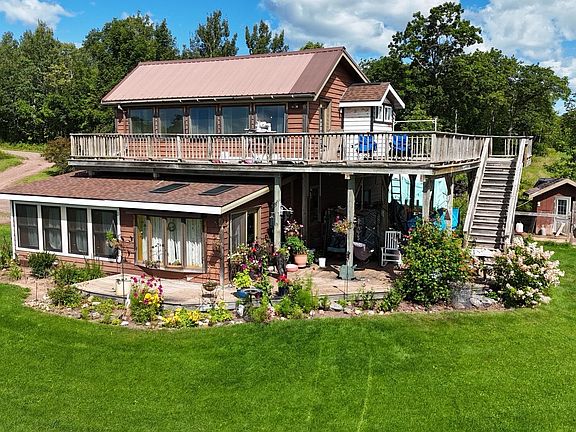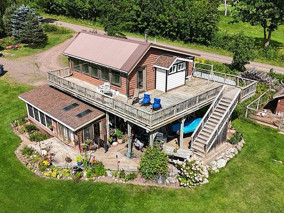 Expansive Views and Custom Craftsmanship Set atop a gently sloping pasture with sweeping views of the Penokee Range, this property offers one of the most breathtaking settings in the Northwoods. Rolling fields, wide skies, and tree-lined horizons surround the home, which is perfectly sited to capture it all from expansive wraparound decks on both levels. Inside, warmth and craftsmanship greet you. A freestanding woodstove on a slate-and-stone hearth anchors the foyer, while custom woodwork—from open-beam ceilings to a handcrafted staircase—gives the home a distinctive character. The open kitchen features custom cabinetry, quality finishes, and connects seamlessly to the dining area and sunroom, all designed to flow toward the outdoor living spaces. The main level includes a spacious bedroom filled with natural light. Upstairs, a full-width bonus room invites flexible use as a lounge, office, or creative space. A newly tiled bathroom, crafted with artisan detail, serves as a centerpiece of the upper level, along with two additional bedrooms. Step outside to the second-story wraparound deck—perfect for watching sunsets paint the pastures in the evening. Beyond the home, the property offers everything you’d want in a self-sustaining country retreat: a two-car garage, beautifully tended gardens, a hen house, and a flourishing orchard. A dedicated pad is already in place for a hot tub, perfectly positioned for starlit nights overlooking the fields. This is a property where custom design meets natural beauty—an idyllic country paradise with views you’ll never forget.