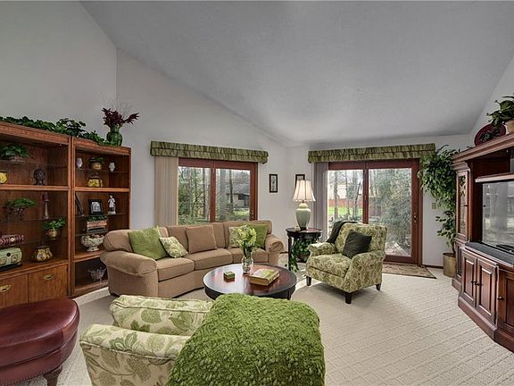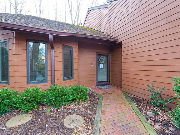 Owner's classic style has created a home of warmth and elegance. Rich cream carpet leads you from room to room. The vaulted ceiling and skylight add architectural interest to the welcoming living room. Cozy up to the wood burning fireplace and gaze out the two sets of sliding doors to the wooded wonder of Mother Nature. Formal dining area. Kitchen sparkles with raised panel cabinetry, new laminate counters and tile backsplash. Frigidaire appliances include dishwasher, slide in electric range, double door refrigerator with ice and water dispenser. Enjoy your morning coffee in the quaint breakfast nook. It's the perfect size for informal dining. Unique bedroom arrangement offers master suites on both 1st and 2nd floor. Both bedrooms easily fit a king size bed. En suite bathrooms have step in showers. Second floor master has a walk in closet and additional 13 x 9 dressing room. Study offers potential for 3rd bedroom. A closet can be added into the attic space over garage. Convenient 1st floor laundry with utility tub. Washer and dryer to remain. This end unit has a 2 car garage and is the only home with two patios. You'll be delighted next spring and summer when you are surrounded by the stunning perennial plantings of Hosta and shade plants. Newer furnace, air conditioning and roof. Impeccable care is evident in every inch of this home.