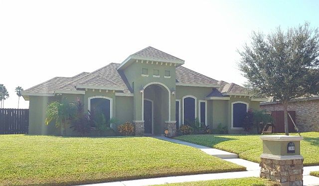 Beautiful north Edinburg home offers custom touches throughout. Laminated wood and travertine tile throughout the home. Decorative high ceilings and open floorplan. Granite counters in kitchen and both bath rooms. Kitchen offers a breakfast bar and custom cabinets. Home has an alarm system and sprinkler system. Home is very secure with a rear entry garage and a rear sliding gate to access back yard and garage. Out door grilling under the covered patio with the large yard will make any BBQ a treat. Sellers are offering a 1 year First American Home Warranty for buyers. They are negotiable and ready to sell.