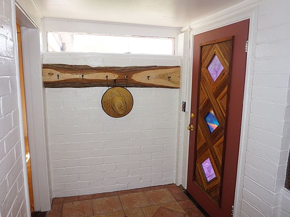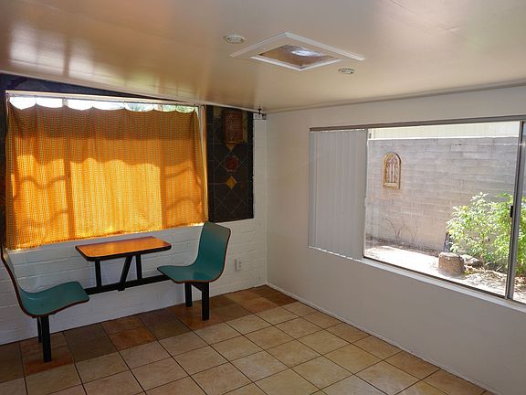 This delightful house is fun and quirky with an artistic vibe! Cool features include a slate accent wall in the Living Room, a hand-crafted wooden front door with glass accents, and a colorful eat-in kitchen. Custom tile and laminate flooring throughout. Two bedrooms plus a den that is large enough for a bedroom or office. Roomy bathroom with extra vanity. Host a BBQ on the shady, covered patio or test your green thumb with a canoe planter in the back yard! Washer and dryer are included. Evap cooling; there is a wall AC unit in the master bedroom. Equal Housing Opportunity.