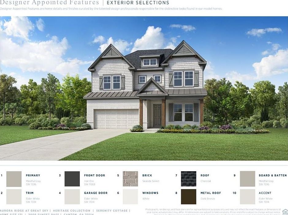 QUICK MOVE IN HOMESITE 131 - SERENITY FARMHOUSE! NEW CONSTRUCTION by TOLL BROTHERS, AURORA RIDGE at GREAT SKY in Canton, GEORGIA. Experience elevated living in this stunning Serenity Farmhouse quick move-in home—where modern luxury, timeless design, and breathtaking views come together seamlessly. Perfectly positioned on a walkout basement homesite, this residence features a covered deck overlooking the tranquil reservoir and lush wooded backdrop, creating an unmatched setting for everyday living and entertaining. Inside, the thoughtfully designed Modern Farmhouse meets Warm Transitional interior blends contemporary sophistication with rustic comfort. The light oak hardwood flooring anchors the open-concept layout, while the white perimeter cabinetry and dark espresso island offer a striking contrast enhanced by marble-look quartz countertops. KitchenAid appliances elevate the gourmet kitchen, combining beauty and performance. This home’s interior palette balances earthy tones and rich wood textures with matte black and brass accents, achieving an atmosphere that feels both refined and inviting. The result is a design that marries modern elegance with farmhouse charm—a space that’s as warm and welcoming as it is stylish and current. With a covered outdoor living space, an expansive basement ready for future customization, and unobstructed natural views, this Serenity Farmhouse offers a lifestyle defined by comfort, sophistication, and connection to nature. Discover the perfect balance of classic warmth and modern design—schedule your tour today and experience what makes this Toll Brothers home truly exceptional. An idyllic lifestyle where vibrancy and tranquility collide is yours, with everything you love just outside your doorstep at Downtown Canton, Laurel Cove, The Mill, Riverstone Parkway, Shoppes of Atlanta. Minutes from Publix, Walmart, Starbucks, Super Target, Chick-fil-A, AMC Theatre, Crumble Cookie, Dicks Sporting Goods, Best Buy, Kohls, Home Goods, TJ Maxx, Ulta, a variety of shops, dining & entertainment, along with easy access to Lake Lanier, North Georgia Mountains, and a myriad of other local parks and recreation activities. AURORA RIDGE AT GREAT SKY is and ideal commuting location just minutes to I-575, Hwy 20, Hwy 140, and Peach Pass lanes to I-75, I-285 and Downtown, Midtown or Buckhead Atlanta. TOLL BROTHERS has been trusted since 1967 to offer the best in luxury home building. Toll Brothers marked 10 years in a row being named to the FORTUNE'S WORLD'S MOST ADMIRED COMPANIES list. Toll Brothers also has been honored as NATIONAL BUILDER OF THE YEAR by Builder Magazine, and was twice named national Builder of the Year by Professional Builder Magazine.
