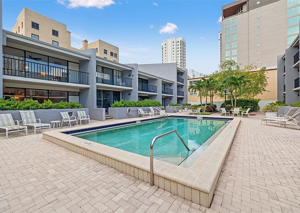 Ditch the car—you won’t need it! If you’ve been searching for walkable downtown living with character, style, and a residential feel, this distinctive three-bedroom townhome in the boutique Fareham Place community may be just what you’ve been waiting for. Ideally located just two blocks from the waterfront, you'll enjoy peaceful surroundings while being just steps from all the energy and excitement of downtown St. Pete. Walk to rooftop bars, award-winning restaurants, sidewalk cafés, coffee shops, museums, galleries, live music, and waterfront parks—it's all right outside your door. This unique townhome offers the best of both worlds with a private entrance, an attached one-car garage with alley access and extra storage, and no need to deal with elevators or parking garages. Inside, you're welcomed by soaring double-height ceilings, an abundance of natural light, and dramatic floor-to-ceiling windows overlooking the community’s lushly landscaped heated pool and spa. The open-concept living and dining areas are ideal for entertaining or relaxing, and the updated kitchen features granite countertops, stainless steel appliances, and plentiful cabinetry. Freshly painted throughout, the home also includes automated window shades for comfort and privacy. Upstairs, the spacious primary suite is a private retreat with vaulted ceilings, a custom walk-in closet, and a beautifully appointed ensuite bath with dual sinks. The split floor plan provides excellent separation, with two additional bedrooms filled with natural light—one of which includes its own private balcony and ensuite bath. This gated 18-unit community is perched 20 feet above sea level in a non-flood, non-evacuation zone—high and dry! HOA fees include roof care (roof replaced in 2024), exterior maintenance, building insurance, cable TV, water, sewer, and trash, making for truly low-maintenance living. A brand-new HVAC system installed in 2024 adds to the value and peace of mind. This is a rare opportunity to own one of downtown St. Pete’s most unique and well-located townhomes—where walkability, privacy, and style meet.