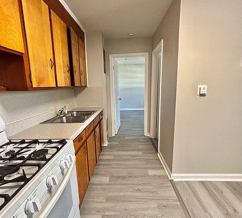 move-in ready. This 1 bedroom/1 bath open floor plan unit has new LVP flooring throughout, new light fixtures, new tile in the bathroom, ceiling fan in living room and bedroom, refrigerator provided and gas stove included. Window unit provided for a/c, gas heat. NO WASHER/DRYER hook ups. Available NOW