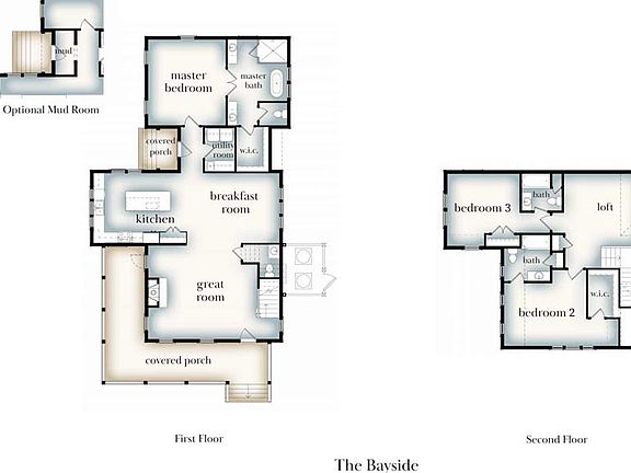 Ideal for entertaining, this three-bedroom, three-and-a-half-bath home embodies easy, coastal style. Step onto the gracious wrap around front porch, grab a rocking chair and take in the fresh air and bay breezes. The spacious great room can be accessed in two locations from the front porch. Once inside, The Bayside's gourmet kitchen will impress with a large island and luxurious finishes. Enjoy casual meals in the breakfast area and sunlight through ample windows. The main level owner's suite with its spacious bath and walk-in closet is an ideal retreat after a day on the Shore. Upstairs, two bedrooms, each with an ensuite bathroom, and a shared loft area provide lovely views and comfortable accommodations for family or guests. Photo and plans are artist's illustration. Subject to change.