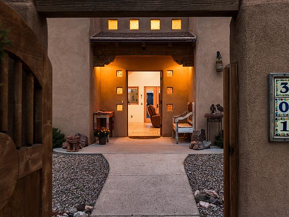 Nestled in enchanting Placitas, New Mexico, this expansive single-story Pueblo-style hacienda invites you to embrace the magic of starry nights under vast desert skies. Spanning 1.25 fully fenced acres, the property offers breathtaking views--perfect for stargazing from your private patios or serene courtyards.Step inside this large, inviting home to discover authentic Pueblo charm with handcrafted beamed ceilings that add rustic warmth to every room. The heart of the home is a gourmet chef's kitchen, equipped with professional-grade appliances, ample counter space, and a spacious island ideal for entertaining. Owned solar panels ensure energy efficiency, keeping costs low year round! Charming casita provides perfect guest quarters or a private retreat. Wild horses visit regularly too!