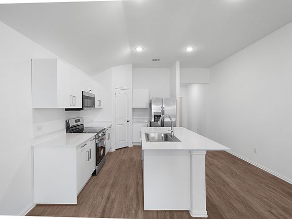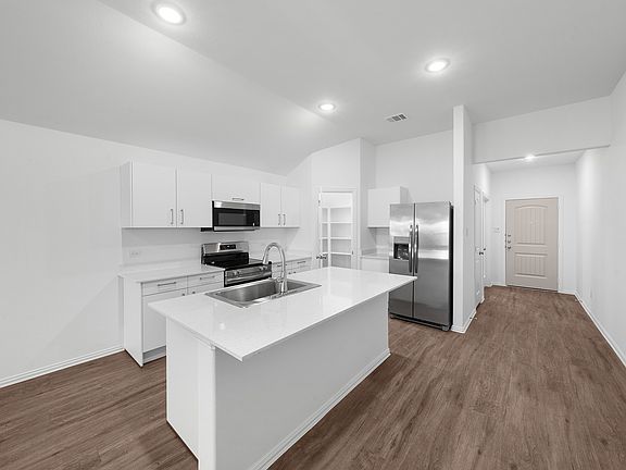 The Cedar floorplan, 1,629 sq ft, offers 3 bedrooms, with 2 bathrooms, an open concept family, dining, kitchen area, primary suite offers an en suite bath with separate vanities and two walk in closets! Each home offers luxury vinyl plank, easy care floors, granite style-quartz counter tops, European style cabinetry, new appliances and a full size utility room. The home has an adorable covered porch, two car garage and privately fenced yard. Enjoy maintenance free lawncare, you only need to maintain the fenced area. Photos are representative of this floorplan, not actual.