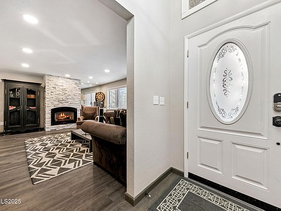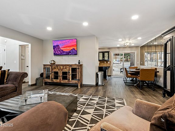 Having an A+ location, this beautifully remodeled home throughout, in move-in condition, highlights this special Middle Kingsbury property. The kitchen features recently updated wood/glass cabinetry, granite tile countertops, stainless steel appliances, gas stove, built-in microwave, pantry, & garden window. The living room features a handsome gas log fireplace, new wine fridge and wet bar. The primary bedroom has a newly installed, beautiful custom tile, double headed shower to die for (!), with double sinks, new lighting, three mirrored closets, & ceiling fan. Other features include newly installed hardwood floors, carpeting, doors & fixtures, blinds and drapes, Nest Thermostat, security system, laundry room, and even central A/C. The spacious, newly installed fenced back yard, features a huge patio/deck area, built-in natural gas fire pit, two other tabletop fire pits, with ample back yard furnishings. Exterior features include a paver driveway, terraced walls, bear box, & gated boat/RV parking! There is a bonus room set up in one of the garage spaces with TV for a separate theater/family room option, or it can be easily converted back to a full, two car garage. Located right across the street from miles of hiking and biking trails, and on a school bus route for early snow removal. Only five minutes to world class skiing at Heavenly Valley, and all the action in the casino corridor, including the Tahoe Blue Event Center. All the brand-new furnishings are negotiable.