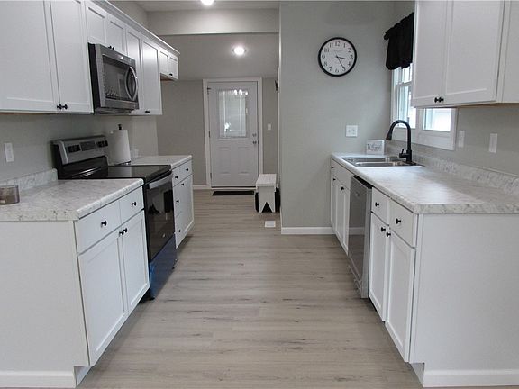 Enjoy the entertaining spaces outside or the fabulous move in ready home. This 2 bedroom home has an enormous family living area that extends into the dining room and into the kitchen. Relax & appreciate your free time while enjoying the new 9 ft. ceilings, trim, drywall, flooring, dishwasher, stove, Central Air, Thermal Pane Argon Gas windows, wiring, plumbing, electrical/lights, doors, kitchen & bathroom, cellulose insulation blown in, paint inside & out. Furnace is a 2016. Huge yard with a 1.5 car garage