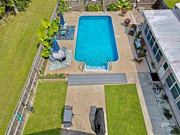 Welcome to 301 Collinwood Loop. A retreat-like lifestyle along Alabama's Gulf Coast in a highly sought-after neighborhood where pride in ownership is shown. The grand entry is flooded with natural light, highlighting the 10-foot ceilings and tiled flooring, setting a tone for the sophistication found throughout this meticulously kept home. The chef's inspired kitchen, featuring an 8-foot island designed for entertaining, showcases granite countertops, a stone backsplash, under-cabinet lighting, a large walk-in pantry, and ample storage space. Premium stainless appliances include a convection oven and a wine cooler. The dining room features large windows and 10-foot ceilings, a chandelier, and plantation shutters. The living room features vaulted ceilings that rise to 13 feet, crown molding, and plantation shutters. The primary suite is spacious and features tray ceilings, an en-suite bath with a custom-tiled walk-in shower, a niche shelf, a seating bench, a frameless glass door, a separate garden tub, a double vanity, tiled flooring, and an expansive walk-in closet naturally brightened by two windows. The three additional bedrooms are spacious, feature large windows, natural light, ceiling fans, and ample closet space. The two additional bathrooms feature beautiful granite vanities and tiled flooring. A light-filled 10X40 sunroom with tiled flooring offers space to relax or serve as a pool room. Step outside to enjoy the 14X24 saltwater pool, with two LED colored lights, and two water features, surrounded by extended concrete decking, privacy fencing, and mature landscaping on a spacious corner lot. There is a 21X24 detached poolside building, ideal for pool and lawn equipment. Additional features include storm shutters, gutters, a water well for the sprinkler system, and a whole-home generator hookup. The extended concrete driveway and double gates add convenience and ample space. Buyer to verify all information during due diligence.