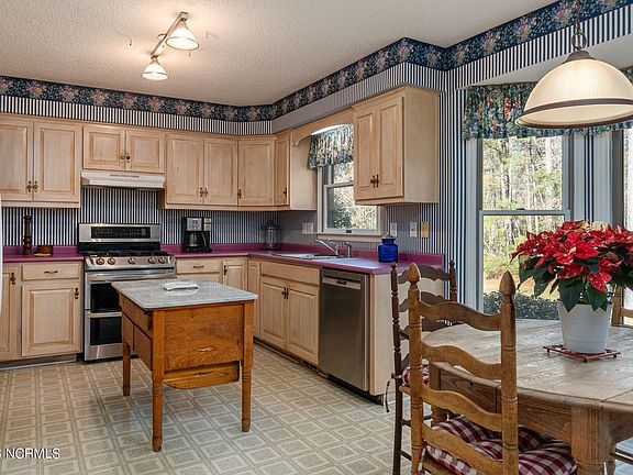 Welcome to your dream home in the charming Home Place neighborhood! This delightful 3-bedroom, 2-bathroom residence sits on a generous 1.33-acre lot, offering you the perfect blend of space and comfort. As you approach, you'll be greeted by a large and inviting wrap-around front porch, ideal for sipping your morning coffee or enjoying the serene woodland atmosphere. Enter inside, and you'll find a cozy living room featuring a fireplace, creating a warm and welcoming focal point for gatherings with family and friends. The formal dining room adds an elegant touch for those special occasions, while the well-appointed kitchen boasts ample counter and cabinet space, along with a convenient eat-in area for casual meals. Cooking and entertaining become a joy in this thoughtfully designed space. The owner's suite is a spacious retreat, complete with travertine tile floors, dual vanities, a luxurious stand-alone soaker tub, and a walk-in shower. Whether you're getting ready for the day or unwinding in the evening, this private oasis is sure to become your favorite place to relax. Head outside to discover a screened-in porch overlooking the expansive and private backyard—a perfect spot for enjoying the outdoors in comfort. Additional features include a shed for convenient storage and a 2-car detached garage, providing ample space for your vehicles and hobbies. At the back of the garage is a heated and cooled office/studio space as well! Although the address is in Pollocksville, rest assured that you're still within the highly regarded Craven County, ensuring access to top-notch Craven County Schools. Plus, you'll be only 10 minutes from the historic charm of Downtown New Bern and under 20 minutes from the Carolina East Medical Center. Don't miss the opportunity to make this beautiful property your home. Call us today to schedule your private tour!