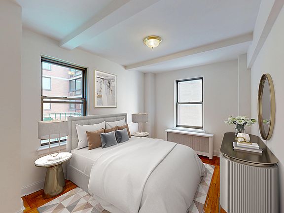 Apartment features spacious living room, separate windowed kitchen equipped with sleek stainless steel appliances, dishwasher and ample cabinet space. Both bedrooms are generously sized, featuring large windows. Beautiful hardwood flooring throughout the apartment adds a touch of elegance.