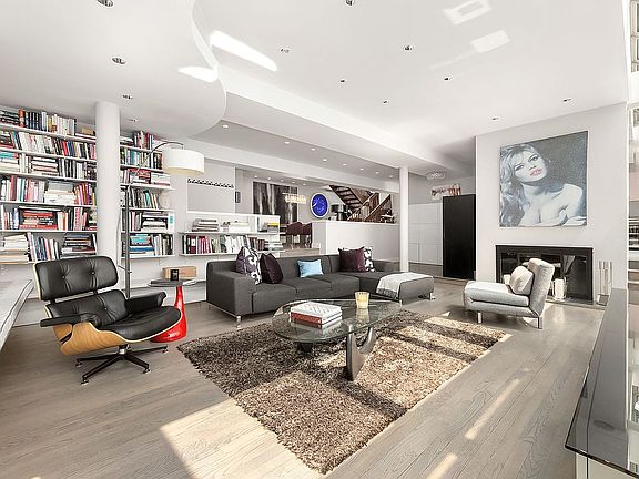 Spanning over approximately 5,000 square feet, the residence immediately impresses with its dramatic 15-foot windows, flooding the home with natural light. The grand south-facing living room is both striking and inviting, featuring a rare, grandfathered wood-burning fireplace and a unique multi-level floor design that subtly elevates the space. A versatile bedroom is positioned just off the living room, offering stunning Chrysler Building views, making it an ideal guest suite or home office. A separate vented laundry room on this level, complete with professional-grade Miele washer and dryer units, adds another layer of convenience.