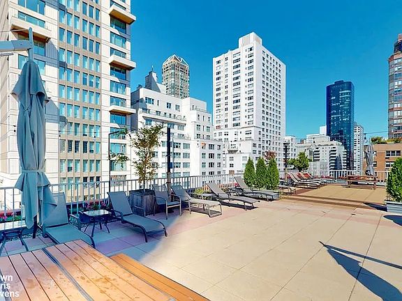 The building delivers every convenience: 24-hour doorman, concierge, live-in super, landscaped roof deck, on-site laundry, package and bike rooms, and direct parking garage access (separate fee; wait list may apply). Storage units are also available (separate fee).