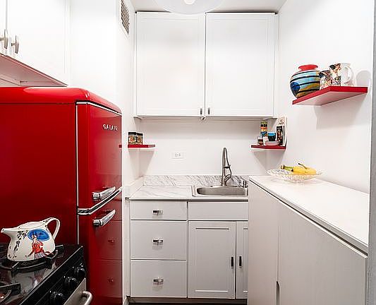 The apartment features a newly updated bathroom and a renovated kitchen with elegant white cabinetry, walnut floors, a stylish Galanz Red Retro Refrigerator, and a new modern AC unit, all enhancing the comfort of this inviting studio.