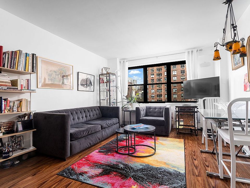 New modern ac unitRenovated studioWalnut floorsNewly updated bathroomElegant white cabinetryRenovated kitchenOpen city views
