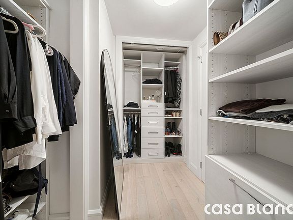 The living area is generously proportioned to comfortably accommodate both a sleeping and lounging space, with custom built-ins that maximize storage without compromising aesthetics. A standout feature is the expansive walk-in closet, rarely found in a studio, providing exceptional storage and enhancing the home’s overall livability. A spa-inspired bathroom features floor-to-ceiling tile, a floating vanity, and high-end fixtures for a luxurious touch.