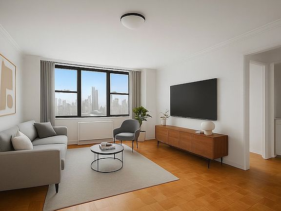 This spacious, high-floor, 1 bedroom 1 bath home offers spectacular city views and great light. The apartment has 5 closets , in unit washer dryer ( few allowed in the building) and enclosed kitchen.