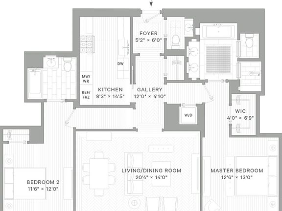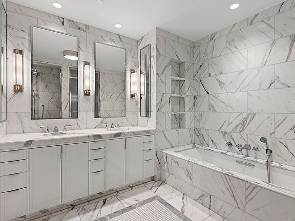 MINT CONDITION 1,384 SQ FT, 2 BEDROOM, 2.5 BATH APARTMENT with a gracious entry foyer, herringbone white oak flooring, and a sunlit living and dining area with Juliet balcony and Studio Sofield detailing. The Christopher Peacock kitchen features Statuary marble countertops, top-tier Sub-Zero, Wolf, and Miele appliances, and polished Dornbracht fixtures. The primary and secondary baths are finished in Statuary and Statuarietto marble with Lefroy Brooks fittings throughout. Additional highlights include a washer/dryer and zoned four-pipe HVAC. Beckford House offers a 24-hour attended lobby, resident lounge with fireplace, dining room and bar, fitness center, yoga studio, and a landscaped rooftop terrace with outdoor kitchen and sweeping views. Residents can also enjoy access (for a fee) to the additional amenities of Beckford Tower, including a 65-foot swimming pool, double-height basketball court, fitness center with yoga and training studios, children's playroom, and a party lounge with a catering kitchen.