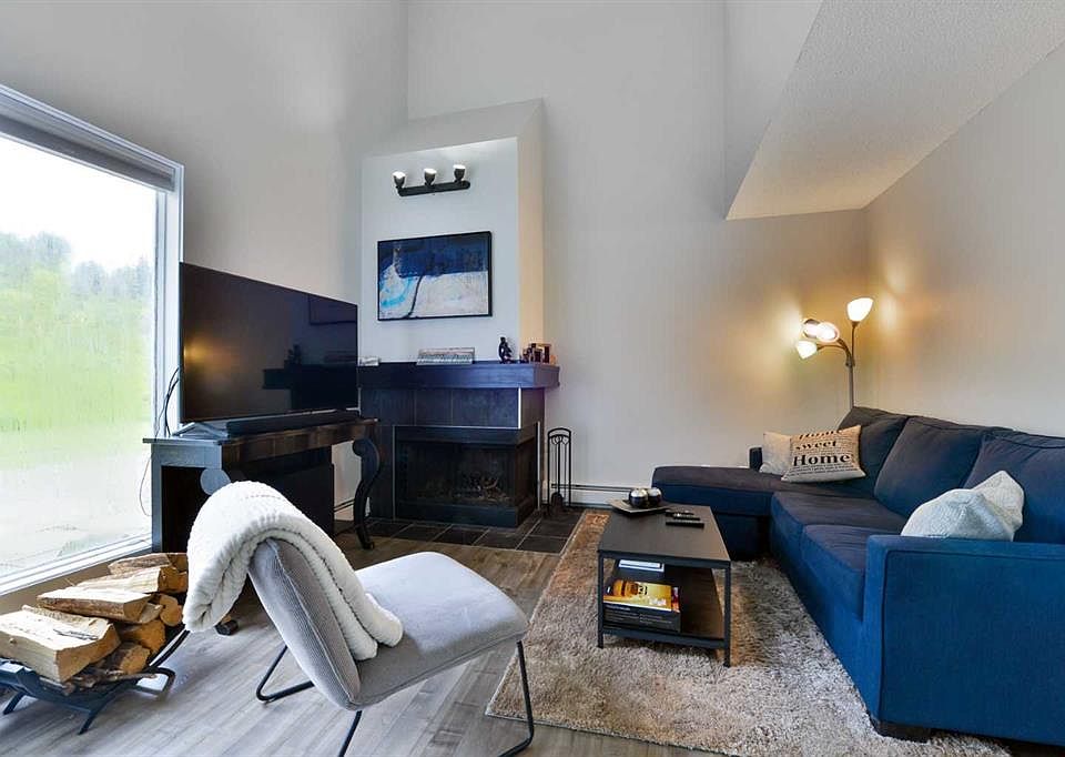 Welcome to the News on Broadcast Hill! Located in the desirable community of Patterson, this beautifully maintained and updated top floor condo offers spacious 2 bedrooms, 1.5 bathroom with 2 heated parking spots is the perfect blend of urban design and sophisticated living. As you step into this inviting condo, you're greeted by a bright, modern hallway with durable laminate flooring that flows throughout the main floor. The functional entry area includes a convenient in-suite laundry closet, a tucked-away storage closet, and easy access to a stylish, well-appointed bathroom. Moving into the heart of the home, the hallway seamlessly flows into the open-concept kitchen, This space is a culinary delight, featuring warm wood cabinetry, sleek granite countertops, a stylish tile backsplash, and recently updated stainless steal appliances. The central island provides a perfect spot for casual dining or meal prep, while modern pendant lighting adds a touch of elegance. Beyond the kitchen, a cozy dining or reading nook provides a perfect space to relax, with direct access to a private patio through large sliding glass doors. The patio, ideal for a BBQ and outdoor seating, extends your living space outdoors and offers a peaceful retreat. As you move towards the living room, you are greeted by a perfect space for a dedicated home office or a stylish mini bar area, cleverly utilizing the open layout. To finish off the main floor the open-concept living and dining area is a true showstopper, boasting soaring vaulted ceilings and that durable laminate flooring. A cozy wood burning fireplace with a modern tile surround creates a perfect focal point, while large windows and sliding doors flood the space with natural light and provide access to the patio that overlooks a quiet greenspace. As you venture up the stairs, you'll discover the private living quarters, which feel bright and airy with a view of the living room below. This level features two spacious bedrooms with plush carpeting and a beautifully appointed four-piece bathroom. The stylish bathroom is a true retreat, boasting a modern vanity, a separate glass shower, a relaxing soaker tub, and contemporary dark tile accents. Additional features of this unit include two assigned heated underground parking stalls, an assigned storage locker, condo fees that cover heat, water/sewer, access to an amenities center which is conveniently located next to the unit building and has an indoor pool, hot tub, gym, meeting/ party room and a tennis court. Located conveniently close to schools, parks, walking paths, and public transportation, with just a short commute to downtown -- Don't miss this opportunity to own a well-maintained home in a complex with a unique claim to fame, having once housed athletes during the Calgary Olympics.