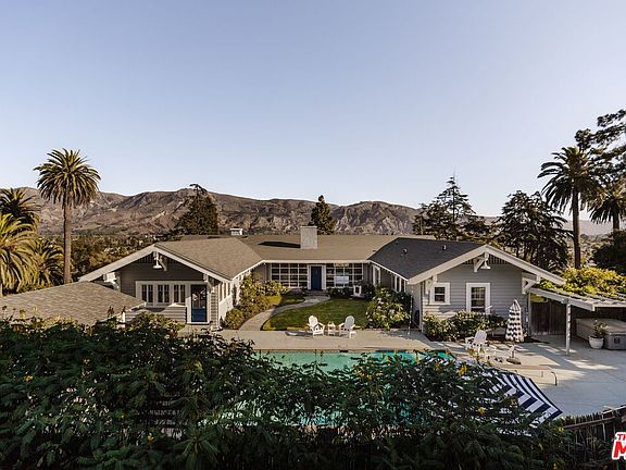 Introducing Los Limoneiros, a hilltop estate with Craftsman character and mid-century influence, built in 1912 by Nathan W. Blanchard, Sr., a member of Santa Paula's original founding family and co-founder of Limoneira, as a gift to his son Nathan W. Blanchard, Jr. and wife Josephine. The residence later underwent a thoughtful 1946-48 reimagining attributed locally to architect Roy Wilson that organized the home around a central courtyard and pool. The renovation was subsequently featured in Sunset magazine in the 1940s. Its name, Los Limoneiros, Portuguese for "lemon lands," honors the Blanchard family's citrus legacy and the Limoneira story. By 1922, one in eight lemons consumed in the United States came from Ventura County, most from Limoneira, earning Santa Paula its reputation as the citrus capital of the world.A long gated driveway ushers you to a single-level, U-shaped footprint wrapped in horizontal siding and set on handsome river-rock base walls. Deep eaves with classic Craftsman brackets meet wide panes of glass and sliders, creating an architectural conversation between eras that floods the interiors with light and valley views. Inside, the living room spans the view side with a wall of glass opening to an extra-wide covered veranda that overlooks the mountain silhouettes, capturing a true indoor/outdoor flow. The dining room is all daylight and greenery, while the cheerful kitchen pairs crisp white cabinetry and long prep runs with a central island, stainless appliances, and charming awning windows for easy cross-breezes. The original two-wing plan remains: a bedroom wing on one side, and a service/laundry wing on the other, connected by a central hall. On the lower level, a generous speakeasy style lounge with bar/kitchenette, fireplace, and flex gym zone offers bonus hangout space. Adjacent, a stone-walled room with arched steel-sash windows and brick flooring, believed historically to have served as a root cellar, invites future use as a wine cellar, workshop, or studio. Outdoors, the property lives like a private park: garden rooms, meandering water features, two tea houses, a classic lawn tennis court, an avocado orchard, and a pool with companion pool house create a resort-style setting from golden hour to starlight. There's even a chicken coop for fresh-egg mornings. The landscape includes over two acres of plantings and dozens of fruit trees: more than 50 avocado trees (Hass, Fuerte, Bacon, Reed, Mexicola, and Pinkerton), along with citrus varieties including Ojai Pixie tangerines, Valencia and navel oranges, Meyer and Eureka lemons, Oro Blanco grapefruit, and calamansi. Additional highlights include chirimoya, pomegranate, guava, persimmon, mulberry, fig, mango, loquat, plum, apricot, and peach trees and more creating a rare collection that enriches both the landscape and the table. The property is further defined by live hedges, mature oaks, California bay, walnut, cedar, pine, olive, pepper, and canary palms, all interspersed with roses for color and texture. Moments from the Santa Paula Art Museum and the Agriculture Museum, with unique outings like Sunburst Railbikes from the historic depot, the estate also places you close to beloved local spots like Tlaquepaque known for their handmade tortillas, Rabalais' a Cajun-inspired bakery and bistro, and Hozy's Grill. Just 16 miles to Ojai, 14 miles to Ventura's beaches, and 65 miles to Los Angeles, Los Limoneiros feels close to everything yet exists in its own world.