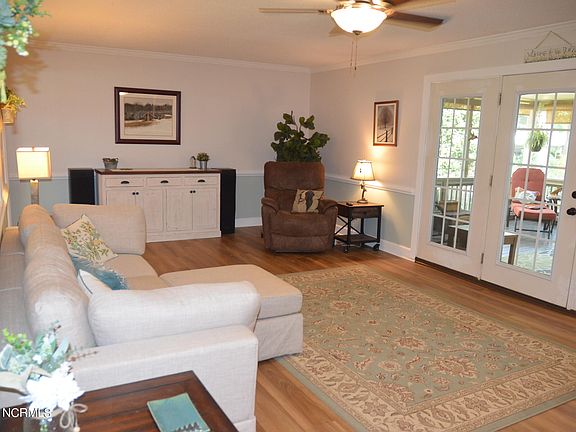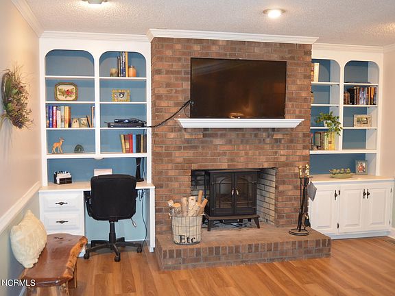 Additional highlights include a brick woodturning fireplace with custom mantel with gas option, elegant crown molding, a walk-in shower and new Corian countertops in primary suite, and an energy-efficient Trane heat pump for year-round comfort with Duke Energy utilities. The home is further enhanced by replacement windows that ensure both efficiency and aesthetic appeal.