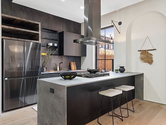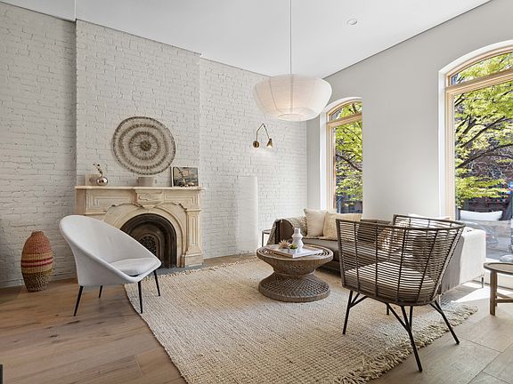 The bohemian chic triplex offers 5 bedrooms and 2.5 baths, a sunny expensive deck off the kitchen areas, and a lush garden. The Parlor level is a sanctuary of calm. Grey-washed wide plank floors, white brick walls a couple of restored marble fireplaces, and 11' ceilings. The chef's kitchen comes with Aster Cucina Italian cabinetry, the prerequisite of high-end appliances, a raw-concrete waterfall island, and large pantry storage with driftwood-restored doors. Two doors lead to an extra wide sunny deck and a stair down to a landscaped garden.
