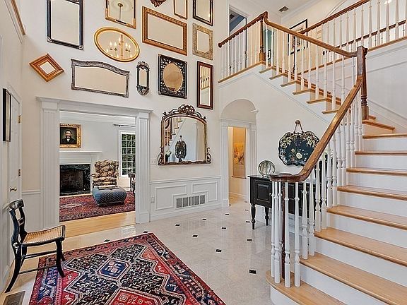 Prepare to be impressed! Stunning home in a desirable neighborhood on 2 gorgeous acres with flowering gardens, terrace, bocce court & stone walls. The oversized foyer welcomes you with marble floors, custom moldings, 2 closets & is open to the library/living room w/built in shelves, hardwood floors and a focal fireplace. Enjoy time with your family & friends in the two story Great Room w/stacked stone fireplace, hardwood floors, a wall of windows overlooking the bucolic property & provides access to the deck for summer barbecues. The cook will appreciate the upscale kitchen with newer stainless appliances, gas cooktop, two sinks, oversized center island w/seating, pantry & back staircase. There are two half baths; one adjacent to the 5th bedroom/study, a mudroom w/separate entrance and beautifully appointed dining room w/tray ceiling & custom moldings. Upstairs are 4 spacious bedrooms, 3 full baths & laundry. The lower level is plumbed for future bath offers multiple possibilities.