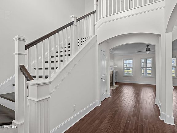 Looking for the perfect blend of luxury, space, and convenience? Welcome home to this beautifully maintained 5-bedroom 4-full bath gem in the highly sought-after Bogue Watch community! Located in the Croatan school district with an easy commute to Camp Lejeune and Cherry Point MCAS, this home checks every box and then some! Step inside to find gleaming hardwood floors throughout the expansive, open-concept first floor. The living room wows with double crown molding, a gas fireplace, and custom built-ins, leading effortlessly into a gourmet kitchen complete with granite countertops, tile backsplash, stainless steel appliances, and a cozy breakfast nook. Hosting dinner? The formal dining room is a showstopper with a coffered ceiling, elegant wainscoting, and a statement chandelier. Convenience is key with a mudroom featuring built-in cubbies, plus a spacious garage with overhead storage and wall-mounted organization. A guest bedroom and full bath on the first floor offers the perfect private space for visitors. Upstairs, you'll find a massive home office with vaulted ceilings, three generously sized bedrooms, a laundry room, and more closet space than you can imagine. Need even more room? Head up to the fully finished third floor complete with a full bath ideal for a media room, teen hangout, man cave, or whatever your heart desires! Step outside to your screened-in back patio and take in peaceful views of the pond perfect for relaxing & entertaining.