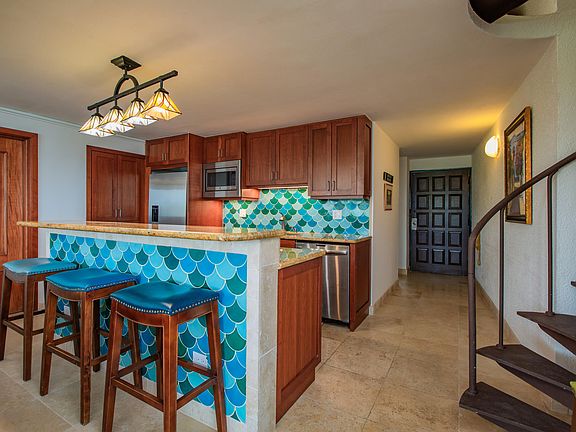 This is THE best location at Mill Harbour! Beautifully renovated 3-bedroom 3-bath condo. Main bedroom in the upstairs loft has a private patio & en-suite bath, split A/C's throughout, impact glass doors, Travertine tile, custom kitchen w/ granite countertops, soft-close drawers & cabinets, stainless appliances, private coffee nook patio beachside, large gallery for lounging and dining so you can take in the huge sea & harbor views! This complex is located just minutes from downtown Christiansted, gated entrance, restaurant, pool & beach. Excellent investment for vacation rental or your winter getaway home!