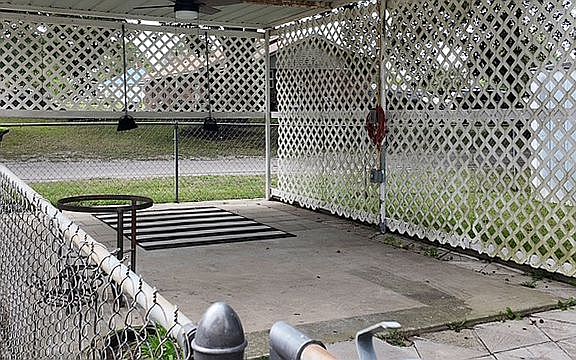 Mature pecan treesCovered outdoor patioChain link fenceLarge well-maintained backyard