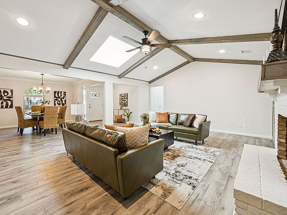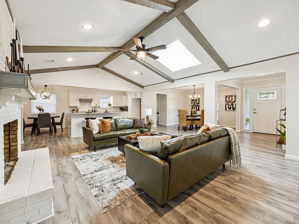 Brilliantly updated 4-bedroom sitting on a spacious corner lot in the heart of the highly sought-after Canyon Creek Country Club subdivision! As you enter the home, you're greeted by a wide open floor plan that's perfect for hosting friends and family. Stylish luxury vinyl plank flooring runs throughout the home's common areas, giving you flooring that's as durable as it is attractive. Share a meal with those closest to you in the formal dining room, lined with crown molding. The living area is highlighted by soaring vaulted ceilings, exposed wood beams, and a white painted fireplace with mantle. The barndoor adds a pop of rustic character to the space and leads to another huge living area perfect for a game room or play room! The second living area is flooded with natural light to create a warm and inviting atmosphere. The gorgeous remodeled kitchen is outfitted with sleek granite countertops, herringbone tile backsplash, stainless steel appliances, gas range, porcelain farm sink, and an island with breakfast bar. Enjoy the convenience of working from home in your private office. Escape to the private primary suite with a remodeled en suite bathroom. It comes complete with a frameless walk-in tile shower, freestanding tub, and dual vanities. With built-in cabinets, the utility room offers extra storage space. Thanks to the spacious corner lot, you'll have more than enough outdoor space in the oversized back yard. The space is enclosed by a 9-foot board-on-board fence, which provides the home and yard with added privacy and security, plus gated entry to the driveway. Zoned for highly-desirable Plano ISD schools! All of this sits on a great lot location just around the corner from walking trails and waterfalls of Prairie Creek Park!