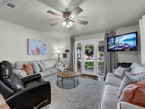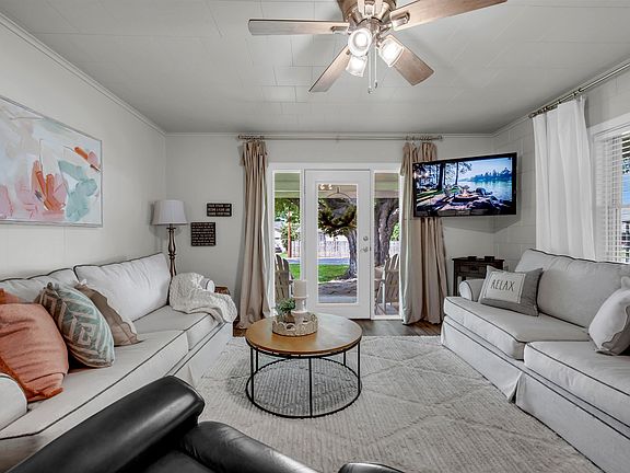 Welcome to your Lake LBJ getaway, where mornings begin with coffee under the shade of a large tree and views of the sparkling lake across the street set the tone for the day. This updated and remodeled single-story cottage perfectly blends relaxation and fun, whether you plan to live here full-time or enjoy it as a weekend retreat. Inside, the home features luxury vinyl plank flooring, two full bathrooms, and a versatile exterior bunk room. The oversized detached two-car garage has been transformed into a game room complete with a pool table, foosball, ping-pong table, seating areas, and sink with hot water—ideal for entertaining guests after a day on the water. Enjoy lake access and beautiful water views just a short walk or golf-cart ride away. A private one-stall electric boat lift, dedicated to this home, is conveniently located within the neighborhood waterfront park . There is also a neighborhood boat ramp steps from your front door, making days on the lake easy and enjoyable. The property includes a sprinkler system, a gated backyard, and comes fully furnished, set up to comfortably sleep twelve. Short-term rentals are allowed, making this a great investment or personal retreat. This cottage has been thoughtfully designed to deliver comfort, convenience, and all the fun that lake life offers—sip, play, relax, and let the good times begin at Lake LBJ.