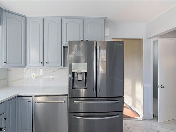 A paver walkway leads to a welcoming open front porch at this renovated raised ranch, set on a desirable corner property. Large windows throughout create a bright, open feel with abundant natural light. The eat-in kitchen is updated with chair molding, wood cabinetry, quartz countertops, a porcelain tile backsplash, high-end stainless-steel appliances, and a picture window, with direct access to the deck. The dining area opens into the spacious living room, complete with a ceiling fan. Three bedrooms are located on the main floor and feature refinished hardwood floors, along with a full hall bathroom. The level also offers multiple closets throughout, providing excellent storage beyond the bedrooms. The lower level includes a large family room with a gas fireplace and ceramic tile surround, an office or media room with exterior access, and a full bathroom with decorative tile and a quartz vanity. A laundry area includes a newer washer and double-capacity dryer. Additional features include central air, recessed lighting, fresh neutral paint throughout, and ample storage on both levels. Outdoor living features a large paver patio with a built-in fire pit, ideal for entertaining. The property includes a one-car detached garage along with driveway parking. Conveniently located near the NY bus stop, shopping, dining, and local amenities.