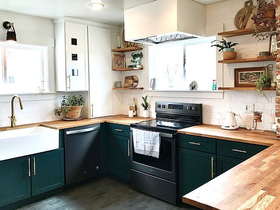 This sweet and charming bungalow is fully remodeled and filled with eye-catching and unique details throughout. This 3 bedroom, 1 bathroom house boasts amazing mountain views from the large dining windows. This home has touches of mid-century modern and reclaimed wooden accents throughout. The main level has red oak hardwood floors full of character. The open kitchen has a new range and refrigerator, a large island and custom cabinetry. The flooring in the kitchen, back door and laundry area is slate. The house has 2 bedrooms, a bath, kitchen, living/dining and laundry area on the main floor. The bonus loft area is the third bedroom/office and an optional extra sitting room. There is a partial unfinished basement with a utility sink and room for storage. White subway tile accents will be found in the bathroom, kitchen and on the stairs leading to the loft area. Welcoming you to this home is a front sidewalk and steps leading up to the front door. The large patio out the back door adds a nice extended outdoor living space. This gem is on a corner lot in a nice walkable neighborhood. It is near downtown Enterprise and the Enterprise school district. It has a good size front and backyard. The living area is a little over 1300 square feet and the unfinished basement is 500 square feet. This is a one of a kind, unique and custom home that is move-in ready! Come make this beauty yours!! Call or text with any questions! (541) 805-5060