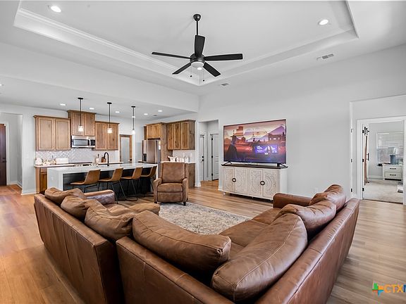 Conveniently located in the desirable Salem Crossing Subdivision on a sprawling corner lot, this custom-built 3BR/3BA + additional flex room delivers the rare combination of luxury, functionality, and irresistible curb appeal. The striking modern exterior paint colors and selections, spacious front porch, and stately presence will wow you as you arrive. This open-concept layout has an abundance of natural lighting; showcasing stunning luxury vinyl plank floors, sleek quartz countertops, and designer finishes throughout. Pride of ownership is evident and you will still have a "new-home" feeling when you see the condition. The chef’s kitchen is a true showpiece with premium upgrades and space to entertain in style. This kitchen features a massive center island, breathtaking quartz countertops, a large walk-in pantry, and ample cabinet storage. This open-concept design flows the kitchen perfectly into the formal dining space and main living area that features coffered ceilings and large windows that overlook the back patio. This primary suite is a sanctuary — boasting an oversized layout, dual vanities, a dedicated makeup area, an exquisite tiled walk-in shower, and a closet that you'll truly appreciate. Each sizeable spare bedroom features its own private bathroom, offering the ultimate comfort and privacy, while the flex room off the front door is ready to become your dream office, gym, or even a fourth bedroom. Every inch of the interior of this home radiates quality, intention, and modern elegance. Walking outside, you'll fall in love with the expansive covered patio — a perfect place to unwind or host unforgettable evenings — overlooking a massive backyard ideal for kids, pets, and outdoor fun. With abundant parking, designer upgrades, and a floor plan that lives as good as it looks, this is the dream home you have waited for!