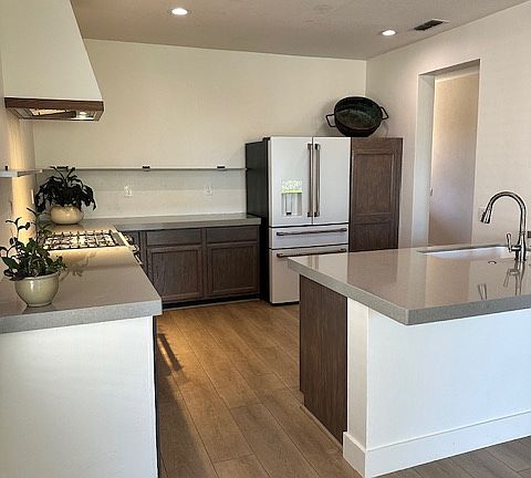 This beautifully updated single-level home has been thoughtfully remodeled with upscale finishes and a layout designed for easy, low-maintenance living so you can enjoy more of what matters most. Step into the fully renovated cafe-style kitchen, featuring quartz countertops, an oversized peninsula, and high-end Cafe stainless steel appliances including a six-burner gas range, custom vent hood, refrigerator and dishwasher, and modern open shelving.