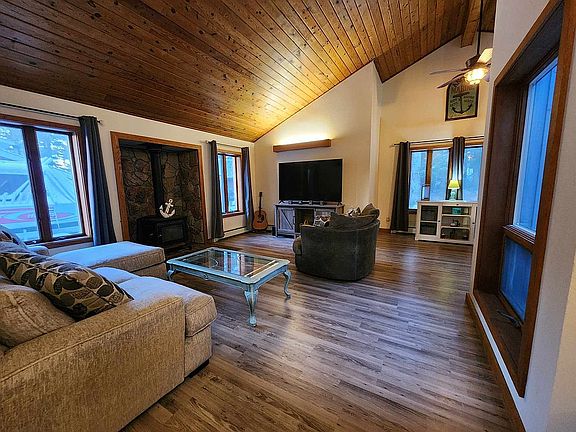 Can you get any closer to that Alaskan lodge feeling? The main floor living room and sitting room boasts cathedral, T&G ceilings, a wood burning stove and beautiful views of a stunning forest and more than 300 berry bushes in the summer months. The kitchen has an upgraded Samsung appliance package (purchased in 2020) and oak cabinets. One of the most unique aspects of this home is the 2-story outdoor atrium in the middle of the house. We have used this space for our smoker, but it would also be a great spot for a hottub, small garden, etc. Just off the kitchen is a large walk-in pantry/laundry area. It's the perfect amount of space for stocking up on dry goods for the long Kodiak winters! Also downstairs is the primary suite, with an exposed beam/T&G ceiling, a large walk-in closet and full bath. There are 2 additional bedrooms on the first level, both of good size, and another full bath, complete with jetted tub. The upstairs loft oversees the 25' entry and the dining room. The loft is a perfect Mother-In-Law suite, with a living room (can be converted into a 5th bedroom), dining area, bathroom and a large swing space. There is a 2.5 car garage with tons of cabinet space and a work bench area. The property also has a 210sqft detached shop! Other details: The boiler was upgraded to a Toyotomi in September 2023. The following appliances will convey: Kitchen refrigerator, stove/oven, dishwasher, washer and dryer. This is a Five Star Energy Home.