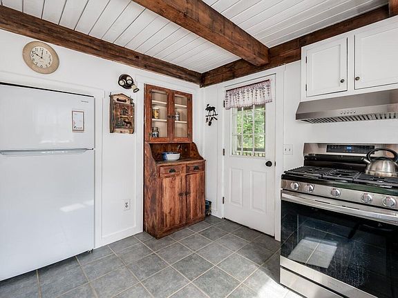 The first floor features an inviting open concept layout that flows seamlessly throughout the main living areas. The heart of the home is the large living room with exposed beams, an efficient wood stove and a beautiful, brick center chimney. A light-filled sunroom with windows galore creates a bright and inviting space for gatherings or relaxation. The large half bath on the first floor includes laundry for added convenience. Upstairs, two bedrooms and a full bath overlook the space below, enhancing the home's airy and open feel.