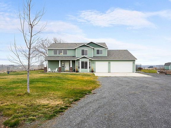 MLS# 289954 Quiet country living with a gorgeous view above Eltopia! Relax and unwind in this exceptional 5-bedroom, 5-bathroom home set on a private 3.48-acre retreat, complete with two primary suites and a spacious 36x48 shop. Designed for both comfort and functionality, this property is ideal for those seeking room to spread out, bring the horses, and enjoy wide-open spaces.An impressive open foyer welcomes you into a thoughtfully designed interior featuring a spacious kitchen with rich cherry cabinetry, a 6-foot center island with veggie sink, and beautiful dark cherry hardwood flooring that flows through the living, dining, and family rooms. The main level includes a private suite, while the primary suite is tucked away from the main living areas for added privacy. Notable builder upgrades include an oversized 4-car tandem garage (30x44) with extensive built-in cabinetry, a workstation, and an additional half bath—perfect for projects and storage. Step outside to the covered patio and take in peaceful evenings and sparkling city-light views.The fully powered 36x48 shop features ceiling fans and its own electrical panel and meter, offering excellent space for hobbies, equipment, or storage. The property is irrigated, including the pasture, and includes a professionally graded dog kennel with added gravel and concrete for easy maintenance. Recent updates include a new high-wind-rated roof (Fall 2024), new exterior paint, heat pump and ductwork (2019), water heater (2020), reverse osmosis system (Fall 2024), REME-HALO whole-house air filtration system (2019), and high-end pet-grade carpet and pad (2019). The septic system was pumped in September 2025. This remarkable property blends space, quality, and thoughtful upgrades—offering a rare opportunity for comfortable country living with modern conveniences.
