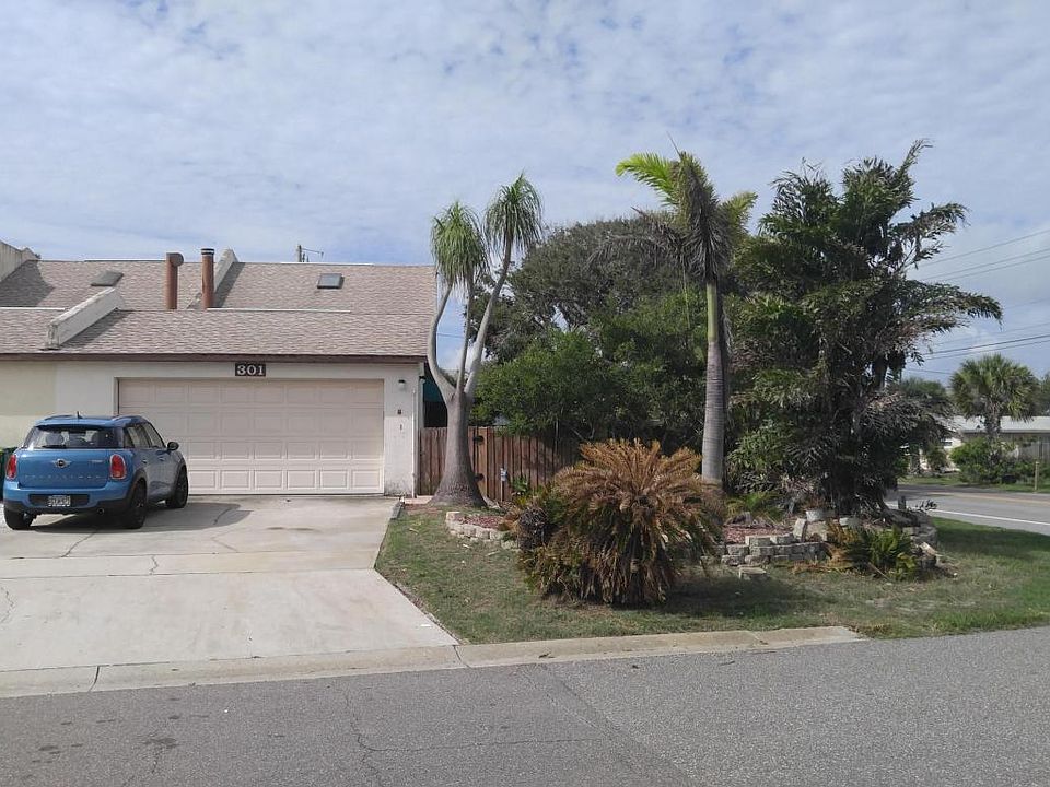 Located only a few steps from the beach! This spacious two story town home is a beachside retreat with an outdoor oasis still in progress. DECKED OUT!, with large deck sitting areas leading to back screened in porch. Hot tub conveys for renters use. Property In process of new sod, mulch, and sand pit area. Property is fully fenced in and nestled on a corner lot. 2 car garage leading to covered front porch area with separate laundry room. Large open floorplan with fireplace and wood panel ceiling, gives this place a cabin style appeal. 2 large bedrooms with private baths, one upstairs and one downstairs. Large open kitchen with island and custom style countertops. This is a lovely townhome waiting for the beach lovers. Brought to you by Solutions Property Management. 321-684-7793. www.solutionsrentalsfl.com