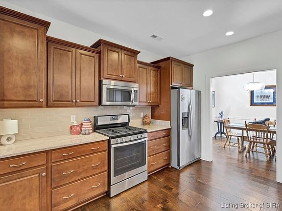 Discover this stunning home in the desirable 'Villas of Floyds Knobs', built in 2017. Featuring 3 spacious bedrooms and 2 full bathrooms, this home offers a perfect blend of comfort and elegance. The kitchen boasts premium cabinetry, nice size pantry, sleek granite countertops, and a layout designed for both style and functionality. Throughout the home, you'll find hardwood flooring, with plush carpeting in the bedrooms and tile in the bathrooms and laundry room. The primary suite is a true retreat, showcasing vaulted/tray ceilings, a generous walk-in closet, a double basin elevated sink, an oversized custom tile shower, and a private commode room.