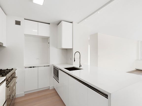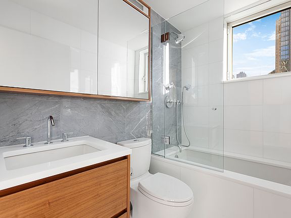 The chef's kitchen is a showpiece with gleaming white quartz countertops, sleek white lacquer cabinetry, a Bertazzoni gas range, Bosch panelized refrigerator and dishwasher, and a stainless steel microwave, while the spa-like bathroom offers scratch-resistant white marble flooring and premium Kohler fixtures. Residents enjoy a 25-story full-service condominium lifestyle, just moments from Central Park, MoMA, Columbus Circle, Rockefeller Center, and the city's best dining, shopping, and entertainment.