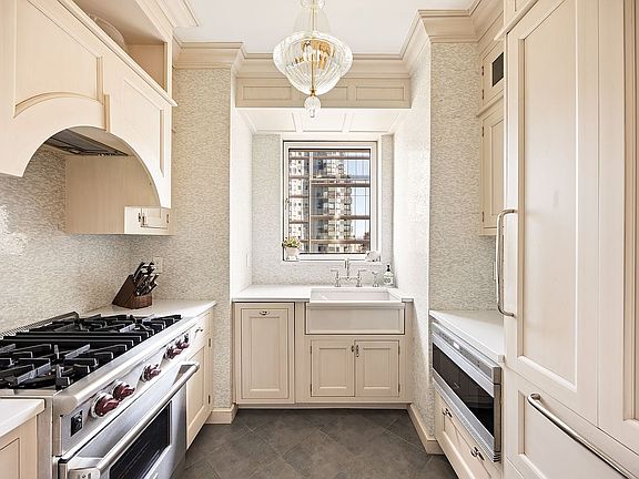 A refined sense of craftsmanship defines the home. French white oak wide plank diagonal floors and crown molding lead to a custom kitchen with bespoke cabinetry, a French farmhouse sink, Wolf range and microwave, paneled Sub-Zero refrigerator, Pyrolave ; enameled lava stone countertops, and floor-to-ceiling Italian glass micro mosaic — all executed with an architect’s precision.