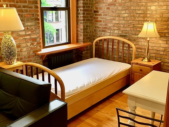 Decorative fireplaceLandmark brownstone buildingExposed brickBeautiful rooftop gardenWindowed sleeping alcoveAmple built-in storageRenovated studio