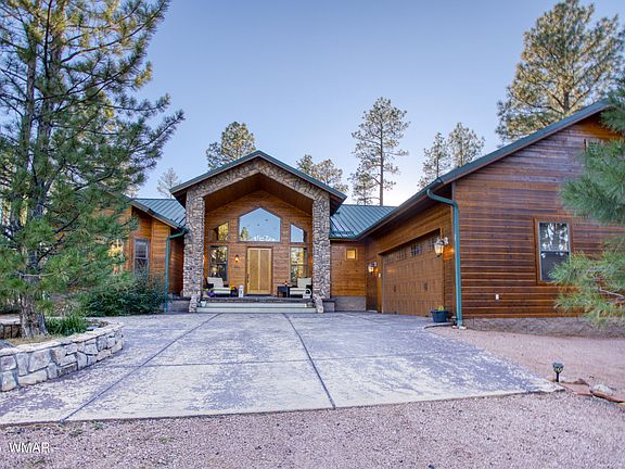Tucked away at the end of a quiet cul-de-sac in the highly sought-after Sierra Pines subdivision, this stunning mountain retreat sits on 1.1 acres surrounded by towering Ponderosa pines and natural landscaping for ultimate privacy and tranquility. From the moment you arrive, the impressive curb appeal and grand covered entryway framed with stone accents make a lasting statement. Step inside to soaring ceilings and expansive windows that flood the open-concept living area with natural light, showcasing the forest views that define mountain living. The inviting great room features a striking floor-to-ceiling stone fireplace and flows seamlessly into the spacious kitchen—complete with an oversized island, abundant cabinetry, and generous counter space ideal for entertain ing or everyday functionality. The desirable split floor plan provides both comfort and privacy, with each bedroom offering a serene, wooded backdrop. The oversized laundry room includes ample cabinetry, countertops, and a sink making organization effortless. Freshly painted interiors highlight the home's bright, open feel, while the metal roof offers durability and low maintenance. Step outside to a beautiful back patio designed for relaxation and gatherings perfect for morning coffee, evening wine, or hosting friends beneath the pines. The oversized two-car garage provides additional space for storage or outdoor gear. This property blends peaceful seclusion with proximity to all of Show Low's amenities, offering the best of both worlds in one of the area's most desirable neighborhoods.