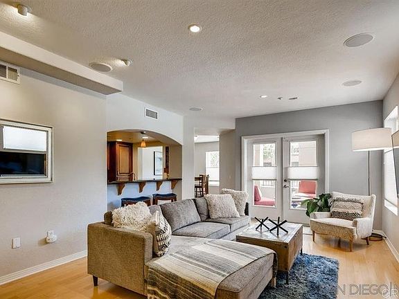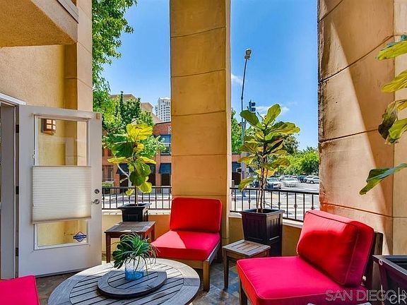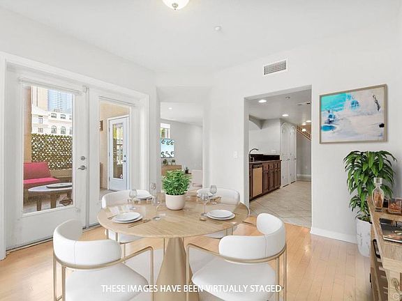 Welcome to luxurious downtown living at its finest in this remarkable City Walk ground level townhome in the highly sought after Marina District neighborhood. Unique to Downtown and the City Walk building this rarely available corner townhome has a separate walkup street level entrance, transcending urban living. This dual primary bedroom residence boasts over 1,680 square feet of living space, offering the comfort and spaciousness of a single-family home right in the heart of the city. Pride of ownership is evident throughout, with light real hardwood flooring throughout the entire property, an open floor plan layout, great natural lighting, newer paint and upgraded professional built in sound system with ceiling speakers and a Samsung tv included with separate theatre sound system. The townhome boasts an oversized hard to find corner exterior private patio that offers a perfect setting for delightful outdoor evenings, entertaining guests and great city views surround you. The patio brings the interior and outside patio perfectly with large french doors. The open kitchen features granite countertops, some recently updated stainless steel appliance and custom cabinetry with pull-out shelves for effortless organization. An adjacent dining space off the kitchen/living room and a powder room barthroom enhance the home’s potential for seamless hosting and daily living. Both bedrooms feature tall ceilings and spacious ensuite bathrooms adorned with stone surfaces and newly updated toilets throughout the home. The primary bedroom includes a large walk-in closet and extends its charm with its own private balcony with city views. Two private parking spaces in a tandem setting also come with this property. City Walk amenities include a fitness center, bbq area, beautifully maintained landscaped courtyards, providing a tranquil retreat amidst the vibrant downtown setting. Enjoy easy access steps out of your front door to amazing dining, shopping, and entertainment options steps away. This unique opportunity redefines downtown city living with unparalleled convenience and comfort that is not your cookie cutter downtown condo. Enjoy the sophistication and spaciousness of this City Walk townhome—schedule your private showing today and discover the allure of downtown living reimagined.