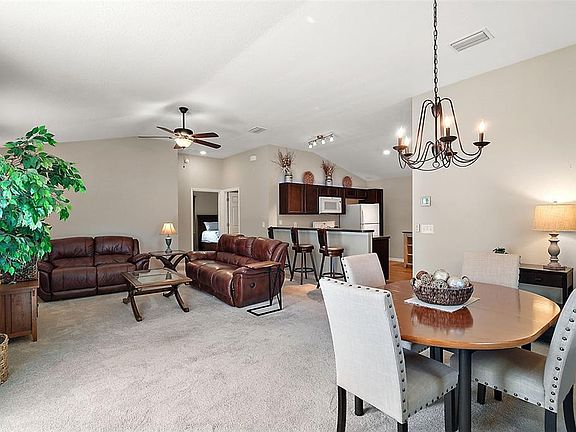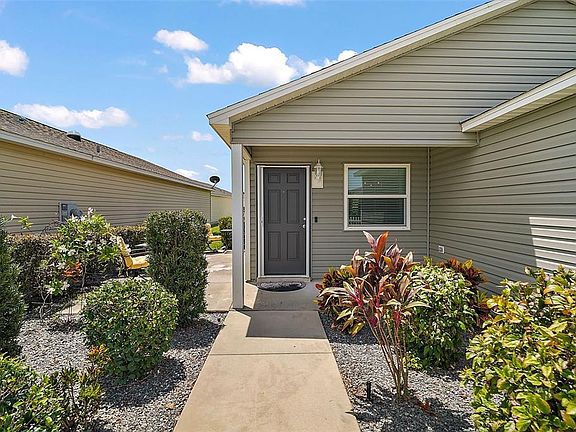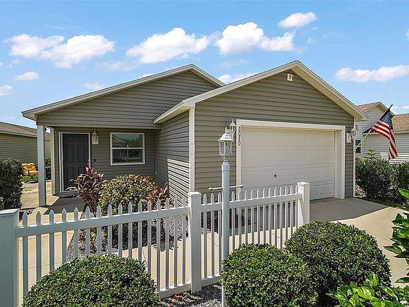 WOW! PRICE IMPROVEMENT OF $10K!! MOVE-IN READY & FURNISHED, spacious 2 bedroom, 1 bath Patio Villa, which also boasts HIGH CATHEDRAL CEILINGS as well as an INSIDE LAUNDRY CLOSET in the kitchen! The kitchen features GAS FOR COOKING, a pantry cabinet as well as a pantry closet for great storage; maple cabinetry and over cabinet LED lighting (controlled by a remote, which changes colors as desired) and of course the popular and functional breakfast bar. The FURNITURE, including wall mounted TV's, conveys with the purchase and offers quality furnishings, including a power king bed in the primary bedroom. Some other features include a hideaway screen at the front entry, RING doorbell cameras as well as a utility sink in the garage, and a 1 1/2 car garage for a vehicle and golf cart parking. This is a wonderful neighborhood, located within the Village of Fenney in Longleaf Villas. Close to the Regional Rec. Center, resort style pool and Fenney Grill. Gorgeous mature trees and nature trails to enjoy Florida nature at it's finest and various Villager activities, golf, putt putt, water volleyball, pickleball, water aerobics and more! Easy access to both 301, which takes you to the Turnpike, 44, or 75 heading to Tampa, Orlando, Ocala, and beyond! Come check it out today!