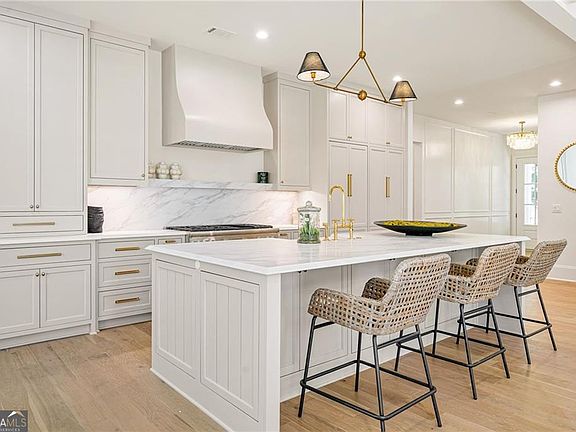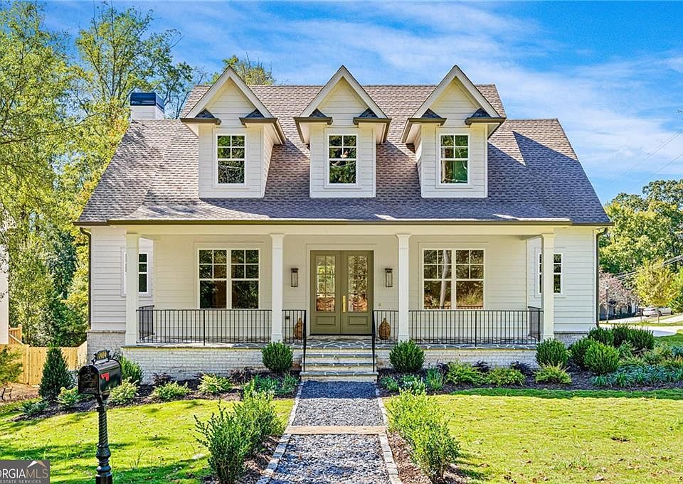 Situated on a prime corner lot in Ashford Park, this newly built 5-bedroom, 4-bath modern farmhouse includes a 3-car garage and unfinished basement for future expansion. The wide flagstone front porch and double French doors open to a bright foyer with detailed millwork and hardwood floors. The designer kitchen features custom cabinetry, brass hardware, marble backsplash, and a large island overlooking the dining area filled with natural light. The family room showcases whitewashed brick, a wood-beam mantel, and tongue-and-groove ceiling, with sliding doors to a screened porch complete with a brick fireplace. Upstairs, the primary suite offers a shiplap-accented tray ceiling, marble spa bath with freestanding tub, and walk-in closet. The private backyard provides space to add a pool, all minutes from top schools, shopping, and dining