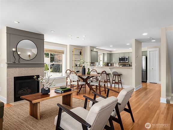 This fabulous 2,290 SF corner unit is filled with natural light and showcases stunning Cascade and territorial views. The entire interior has been freshly painted and the beautiful fir floors have just been refinished. Three spacious bedrooms—perfect for guests or working from home—each with its own bathroom. Open floor plan with generous living and dining areas, a stylish kitchen with stainless appliances, bar seating, and pantry. Cozy up by the gas fireplace or entertain outdoors on multiple decks. Luxurious primary suite with vaulted ceilings, huge closet, and 5-piece bath. Newer furnace, hot water tank, and central AC. Attached garage with 240v EV charger + second off-street space. Queen Anne living at its best!